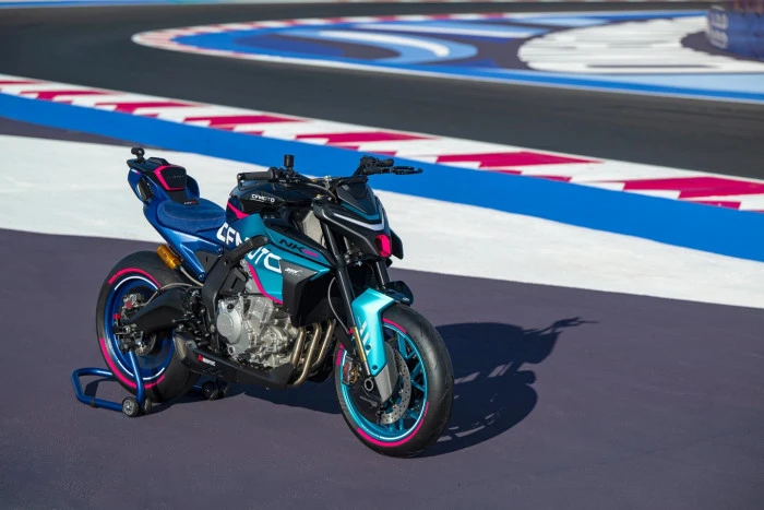CFMoto, bu konseptin belirli bir seri üretim modelinden ziyade, markanın naked motosiklet sınıfındaki uzun vadeli hedeflerini sergilemek amacıyla geliştirildiğini vurguluyor. Açık mavi ve pembe tonlardan oluşan renk şeması, MotoGP padoklarından ilham alan yarış kimliğini açıkça yansıtıyor. 15 litrelik yakıt deposu da parlak siyah yüzeyler ve pembe detaylarla bu temayı devam ettiriyor.