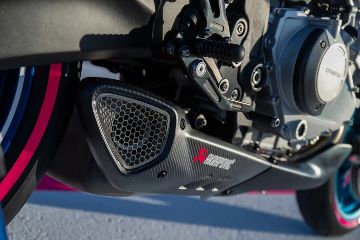 Alt konumlu Akrapovič egzoz sistemi, sağ ayaklık altından çıkış alarak agresif görünümü güçlendiriyor. Tam yarış egzozundan ziyade konsept estetiğini öne çıkaran bu yapı, modelin görsel etkisini artırıyor.