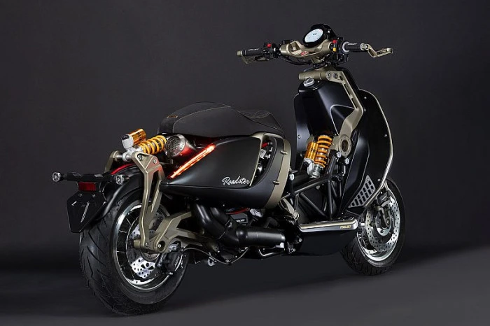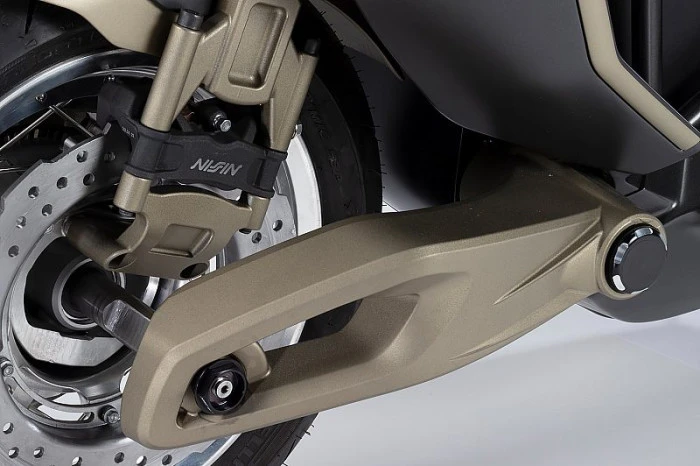 Mat siyah ve bronz renk kombinasyonu, çok katmanlı sele tasarımı, CNC işlemlerle üretilmiş parçalara entegre LED sinyaller ve işçilik kalitesini öne çıkaran detaylarla model, yüksek segment bir scooter izlenimi veriyor. Hafif alaşımlı telli jantlar büyük fren disklerinin arkasında konumlanırken, tüm aydınlatma ünitesinde LED teknolojisi kullanılıyor.