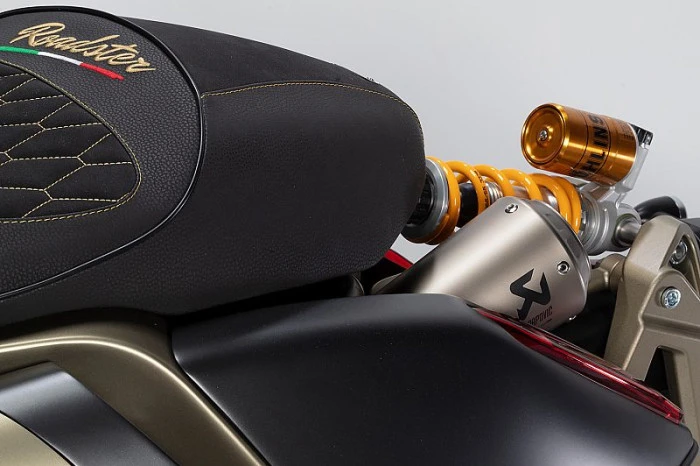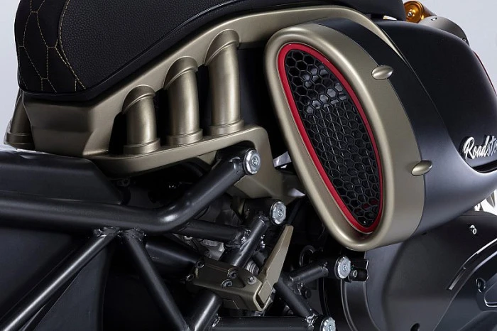 Dragster’ın sert hatlarından uzaklaşan Roadster 400, geçmişin siluetlerine gönderme yapan fakat savaş uçaklarından ilham alan tasarım anlayışıyla dikkat çekiyor. Modelin gövdesinde yer alan türbin benzeri yan hava kanalları hem estetik etki yaratıyor hem de iç tarafta konumlandırılan çift radyatöre soğutma desteği sağlıyor.